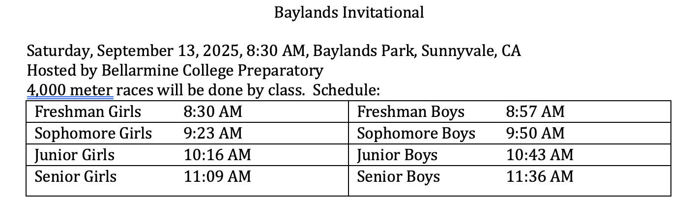The Baylands Invitational is a race that the Bellarmine Cross Country hosts at Baylands Park in Sunnyvale. One unique thing about this early season event is that the runs are based on grade level. There is no Frosh/Soph, JV, or Varsity division. Boys will run at their grade level: 9th, 10th, 1tth, or 12th grade. This course is about 4k in length.